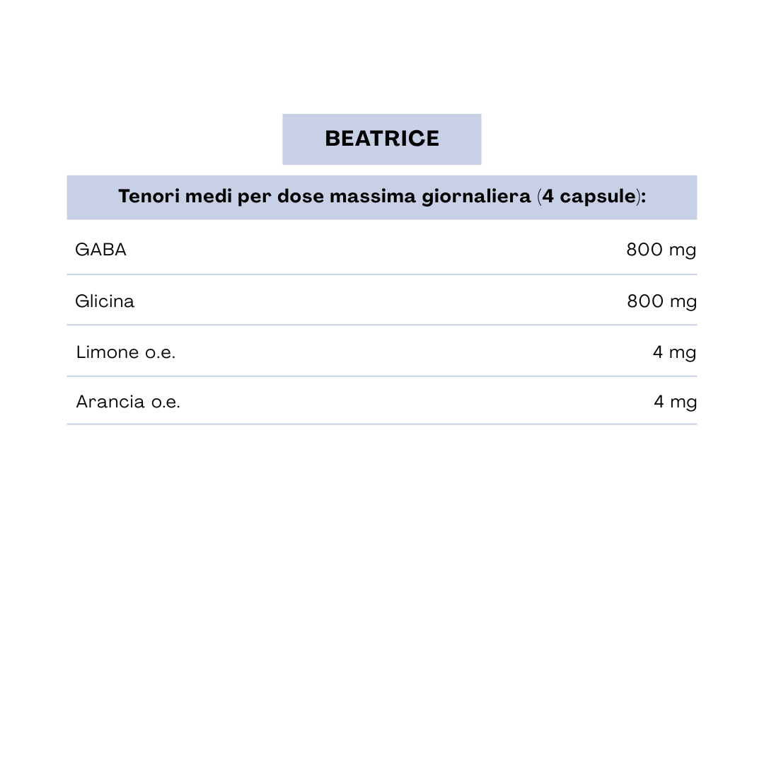 Agendo sull'equilibrio tra eccitazione e inibizione nelle reti neuronali, Beatrice aiuta a regolare l'umore e a promuovere il benessere emotivo, fornendo un supporto concreto nella gestione dello stress quotidiano.