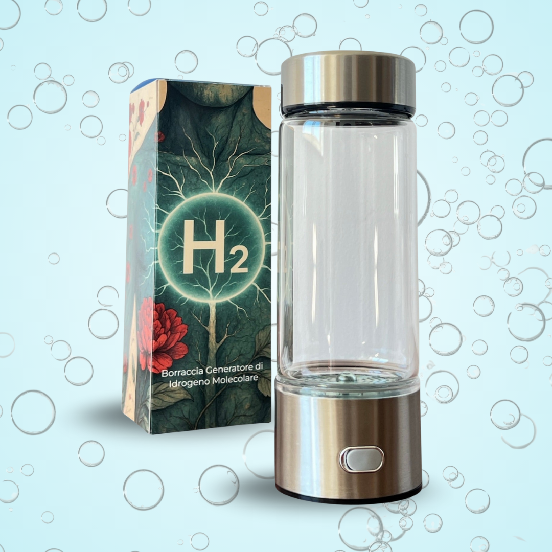 Dispositivo portatile che genera idrogeno dall’acqua tramite elettrolisi con membrana PEM. La cella utilizza piastre in titanio e platino, completamente senza ferro, per favorire purezza del gas e stabilità di produzione. Materiali di qualità (vetro borosilicato, componenti in acciaio inox, BPA free). Focus su assorbibilità/biodisponibilità dell’H₂ disciolto e costanza delle prestazioni.